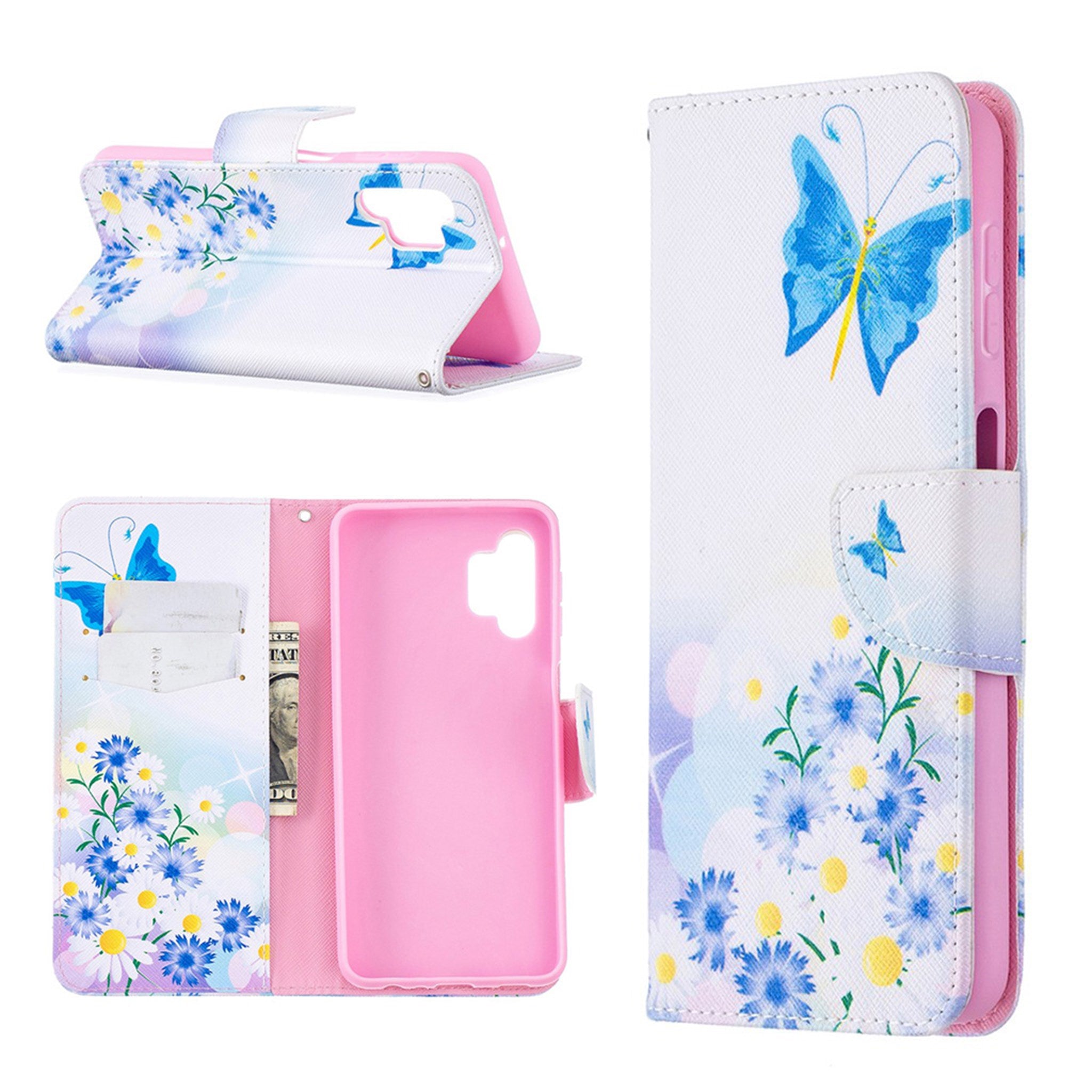 Butterfly Samsung Galaxy A32 5G leren Hoesje - Blauwe Vlinder En Bloem