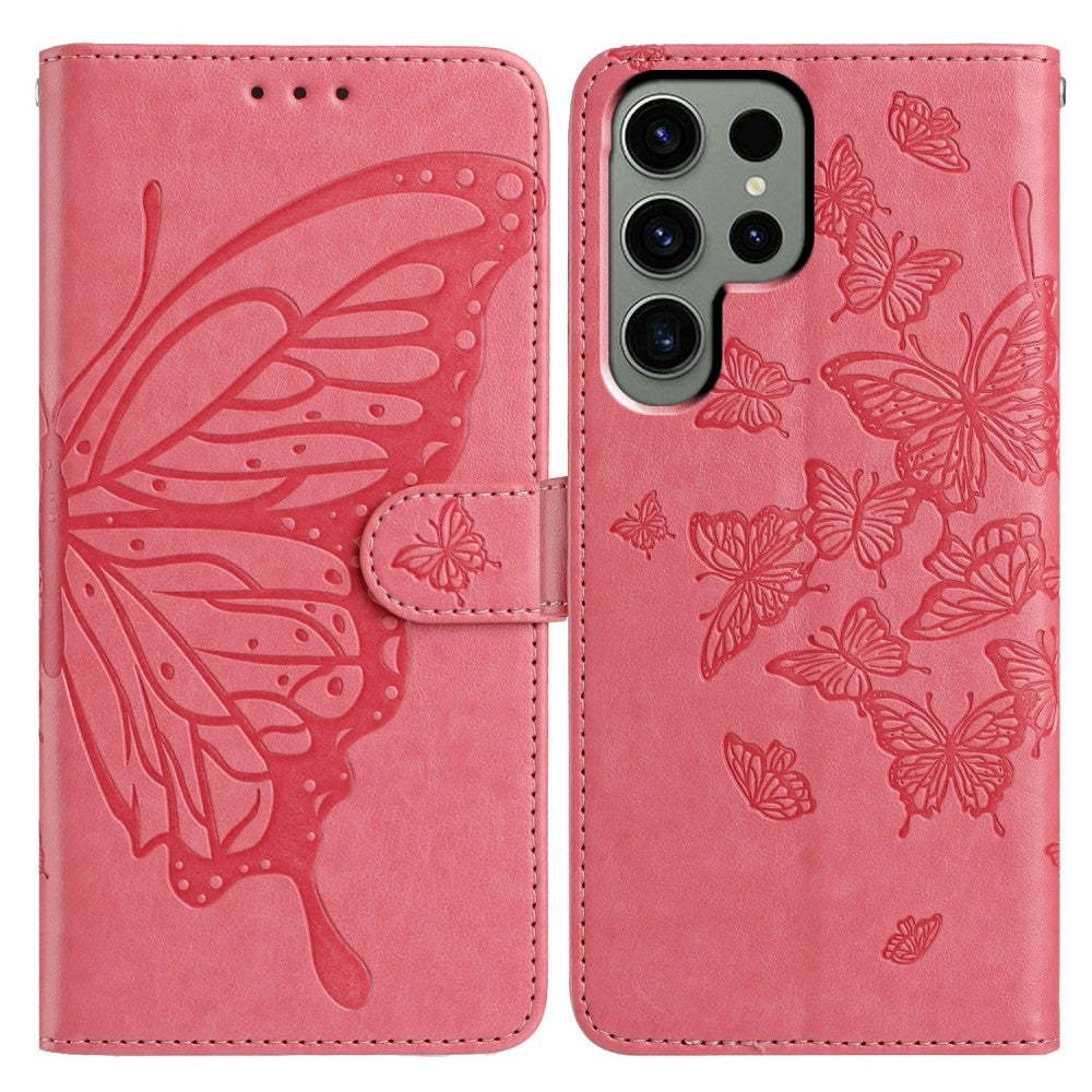 Étui pour Samsung Galaxy S24 Ultra Portefeuille avec support Imprimé papillon Étui à rabat en cuir vegan avec sangle - Rose