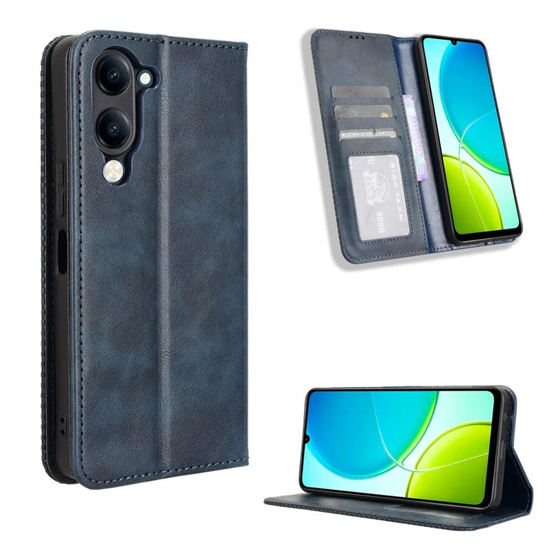 vivo Y29s 5G / vivo Y04 4G Retro Vegan Lederen Hoesje Telefoon Portemonnee Stand Cover - Blauw